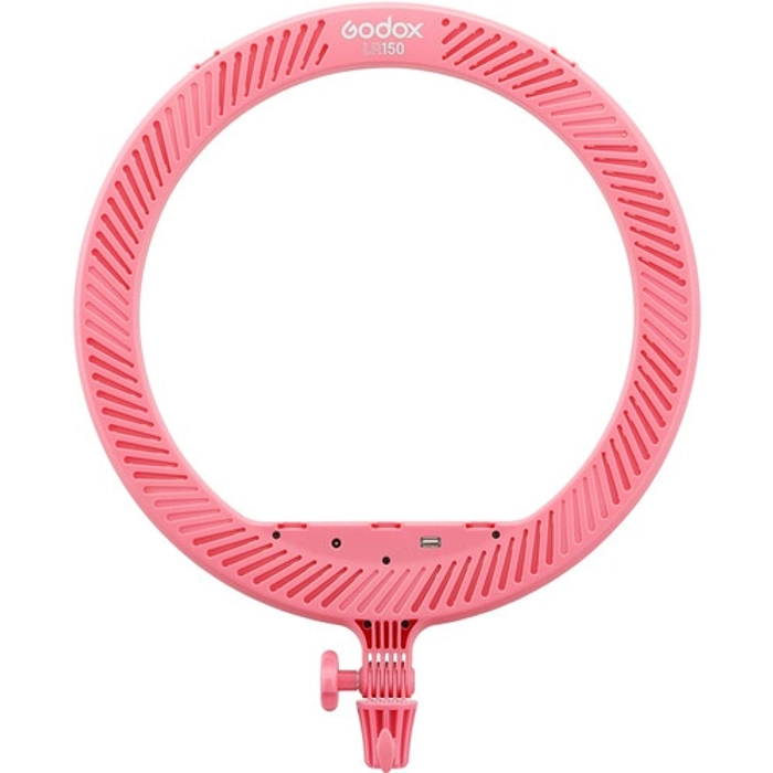 This LR150 Bi-Color LED Ring Light in pink from Godox has a distinctive shape and variable color temperature from 3000-6000K to match other fixtures, ambient light conditions, or just for creative expression. The light can be mounted to an optional grip head or stand, allowing you to shoot through it for a silky smooth, near-shadowless effect that is flattering to your talent's complexion. A smartphone holder is included which makes it great for selfies. The light creates unique circular catchlights in your subject's eyes and you can make color and light intensity adjustments from a simple knob on the fixture. It runs on USB power so you can take it anywhere and operate it from your computer, laptop, or a power adapter.